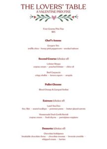 Join Street Legal Catering on Valentine’s Day upstairs at Mountain Lake Lodge for a very special 4-course prix fixe dining experience.